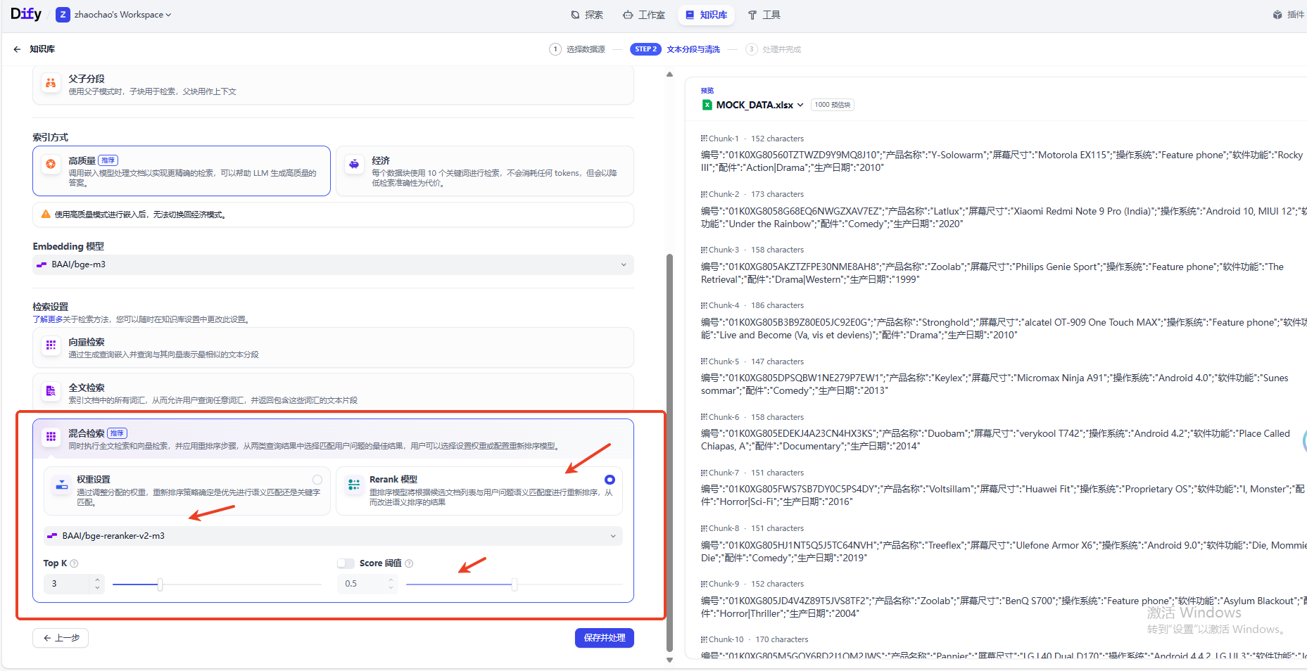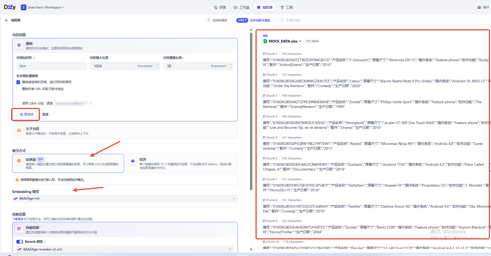 这里我使用的是硅基流动平台订阅的免费Embedding模型,点击预览块我们可以检查一下知识块是否完整,假设文档里面字符最多的记录可能是900,那么我们分段长度应该设置超过900,例如1024,才能保证检索出来的Chunk完整性。