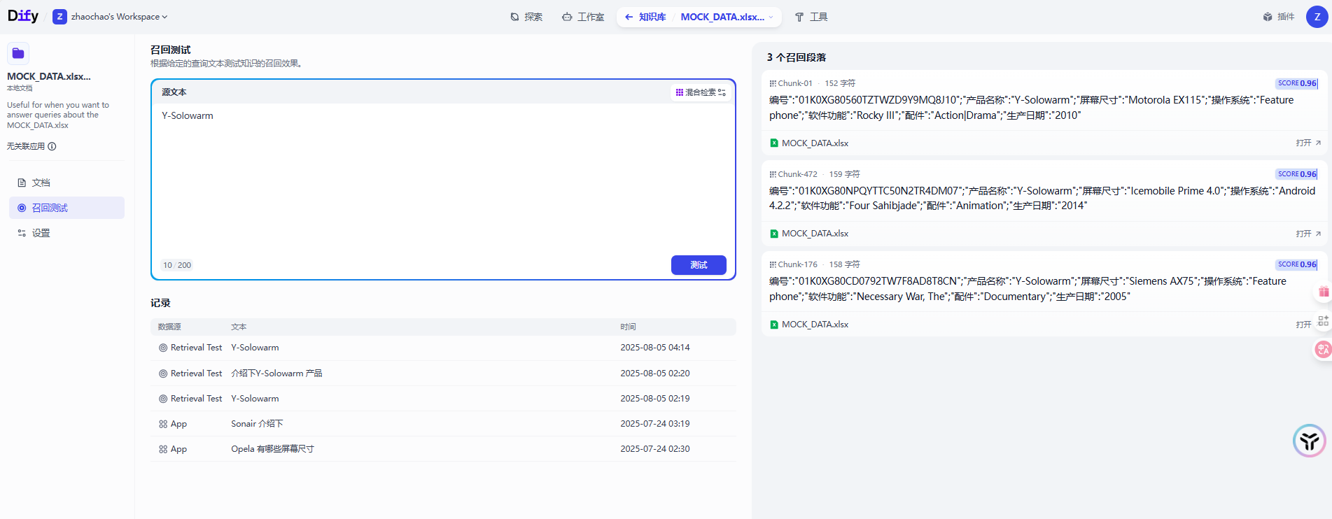 文档处理完成后我们可以在召回测试这里测试一下知识库检索的效果,可以看到这里的检索效果还是比较理想的