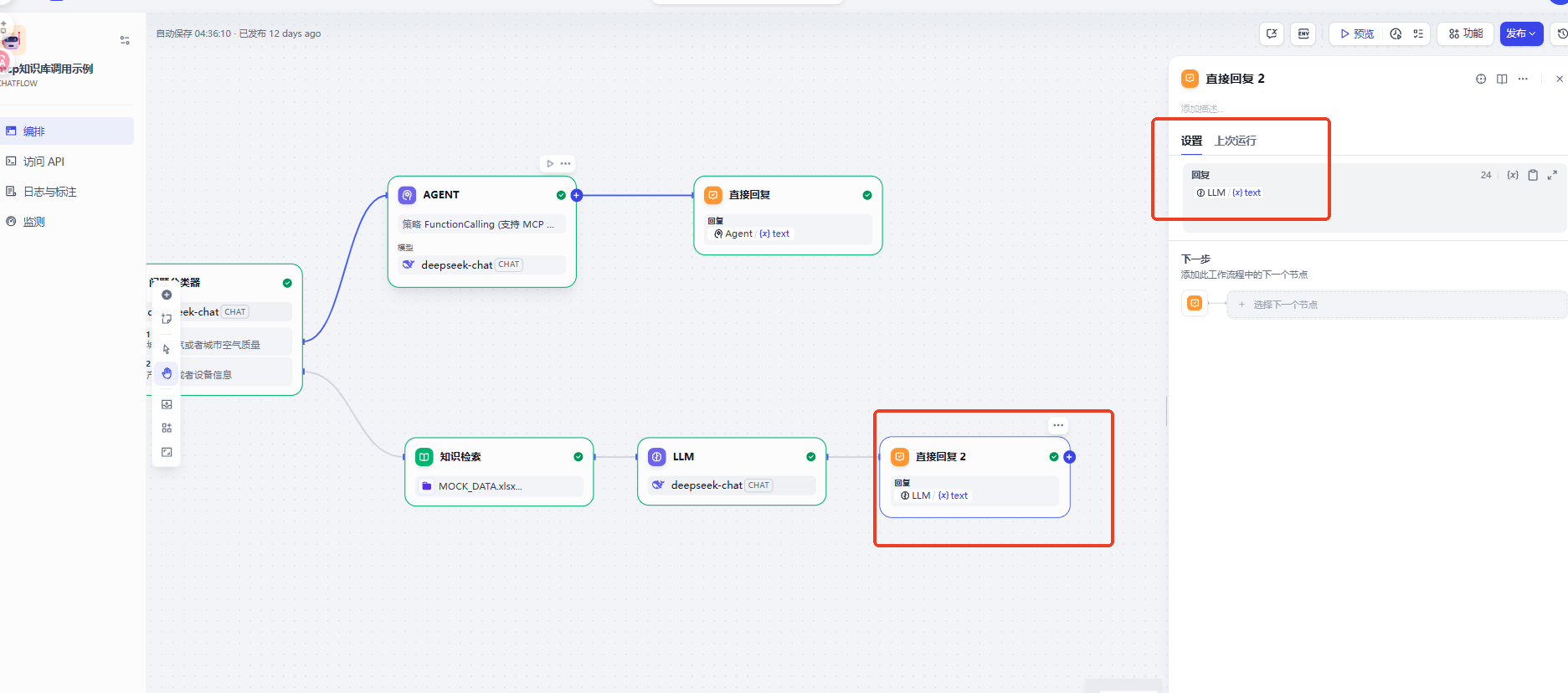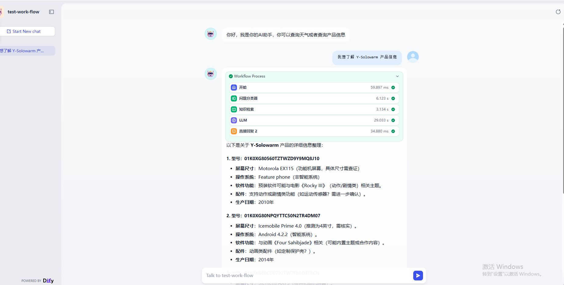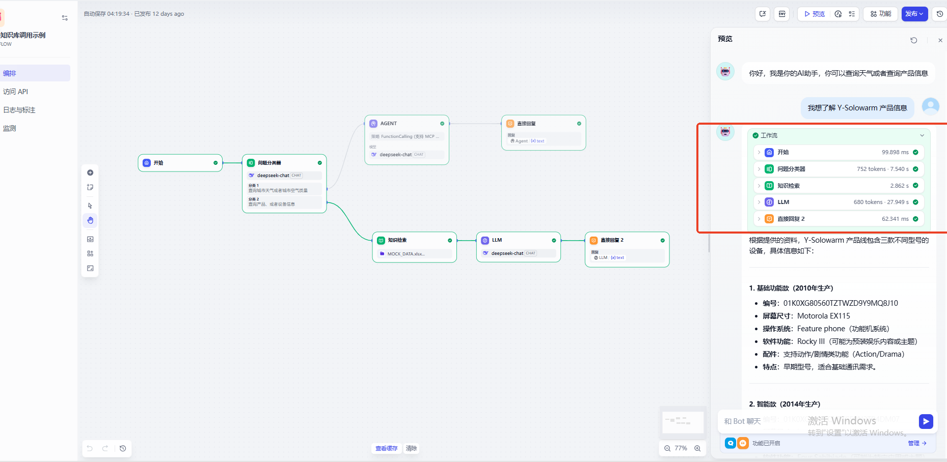 可以先看一下最终需求的实现效果,当我们咨询产品信息的时候工作流会自动调用知识库检索