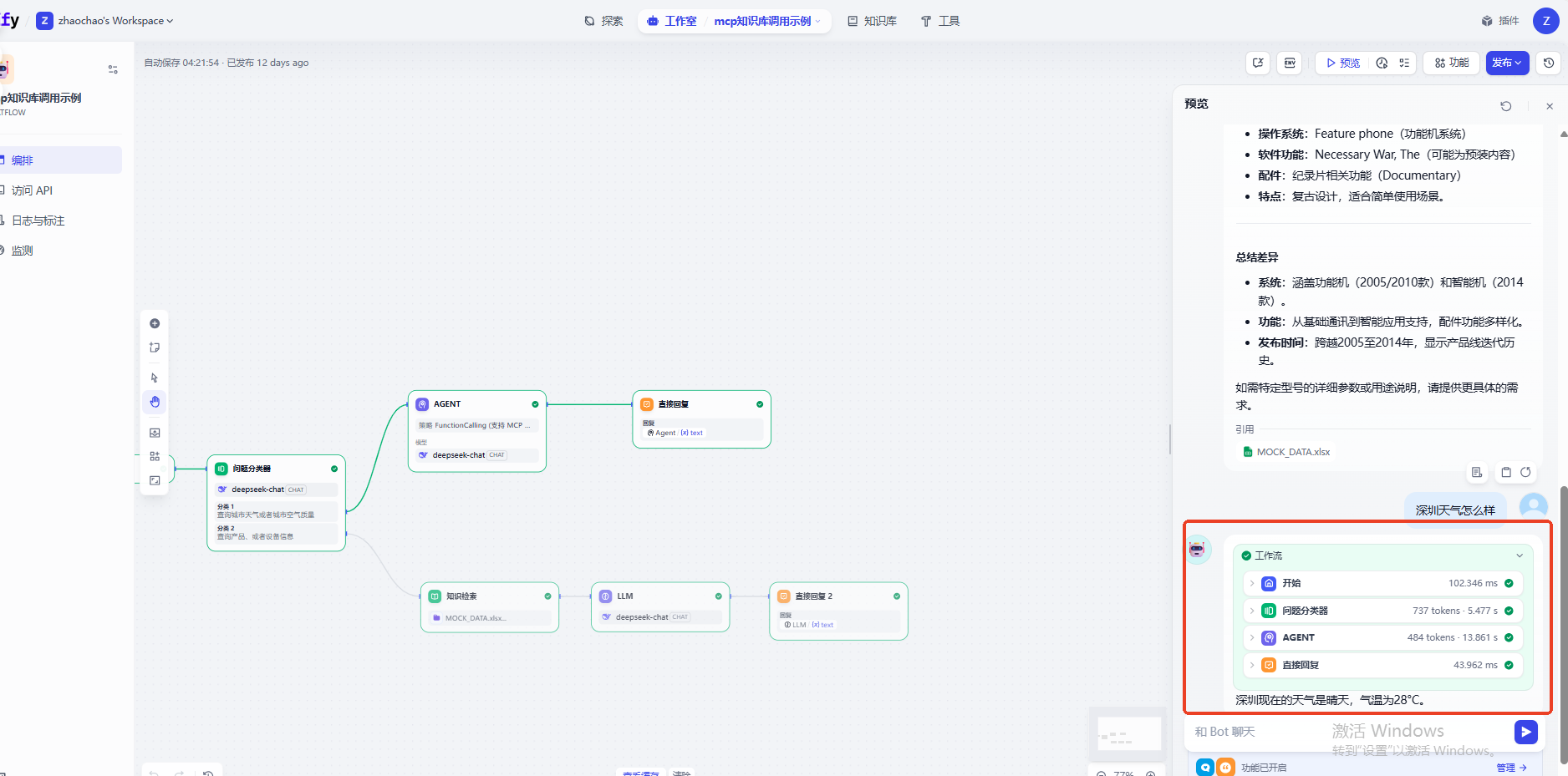 而当我们查询天气相关问题的时候,工作流Agent会自动调用MCP接口给用户回复