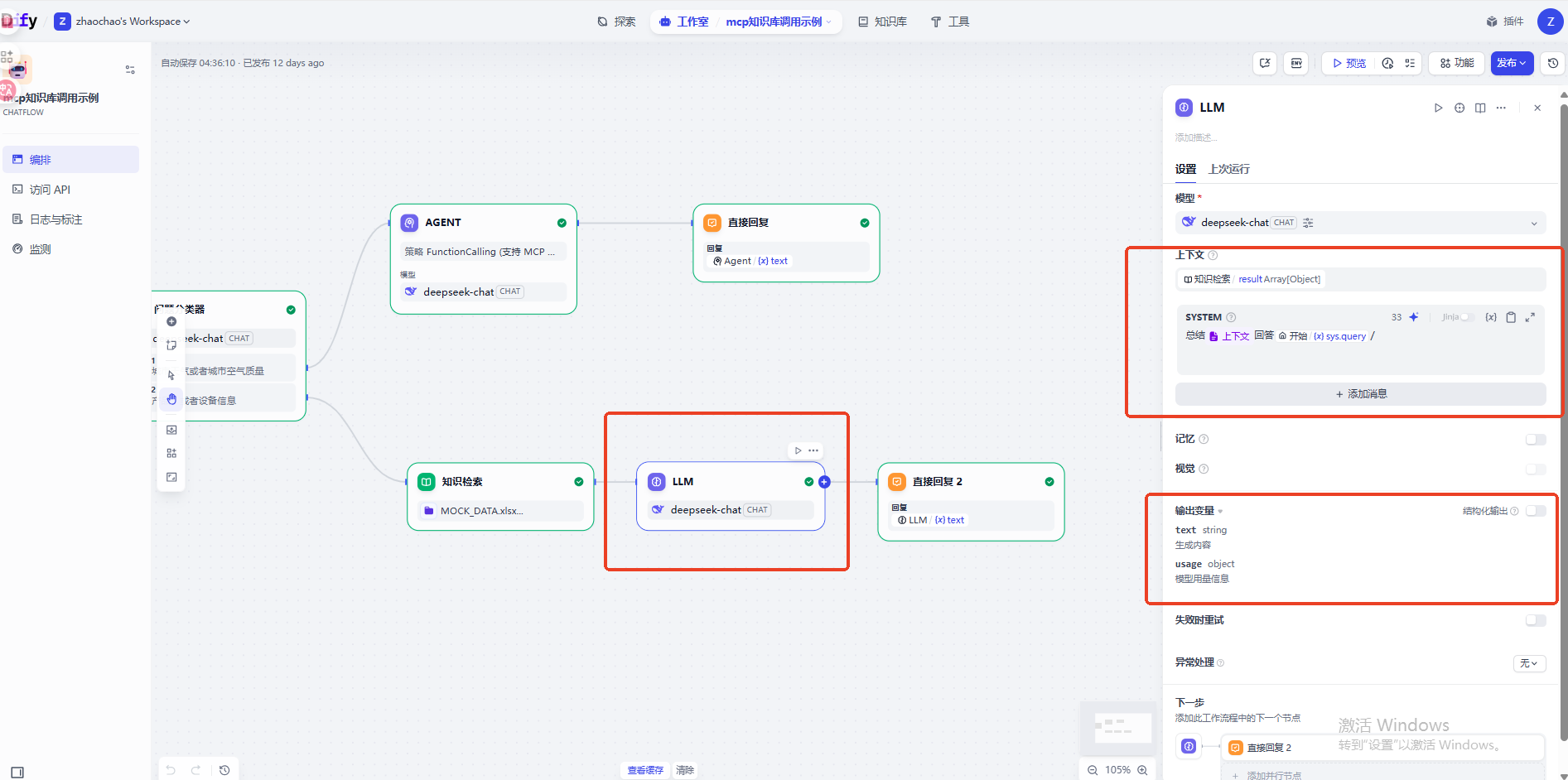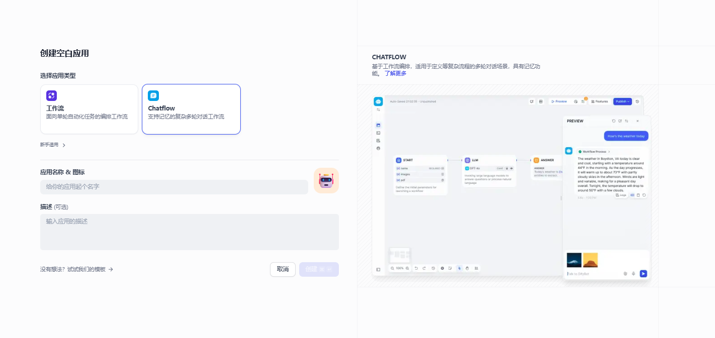 需求的实现方式有很多种,这里使用的是CHATFLOW,可以立即为带记忆能力的工作流,本质还是工作流