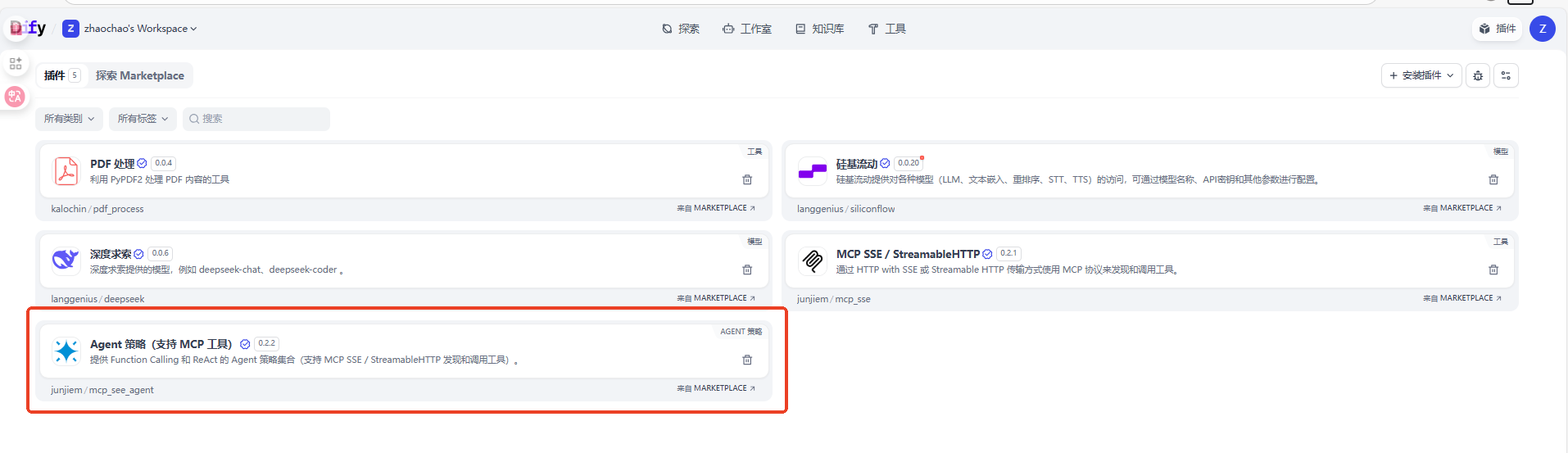 Dify默认不支持MCP调用,但是我们可以添加Agent MCP调用工具,让Agent实现工具调用,点击右上角插件,安装MCP的调用工具。