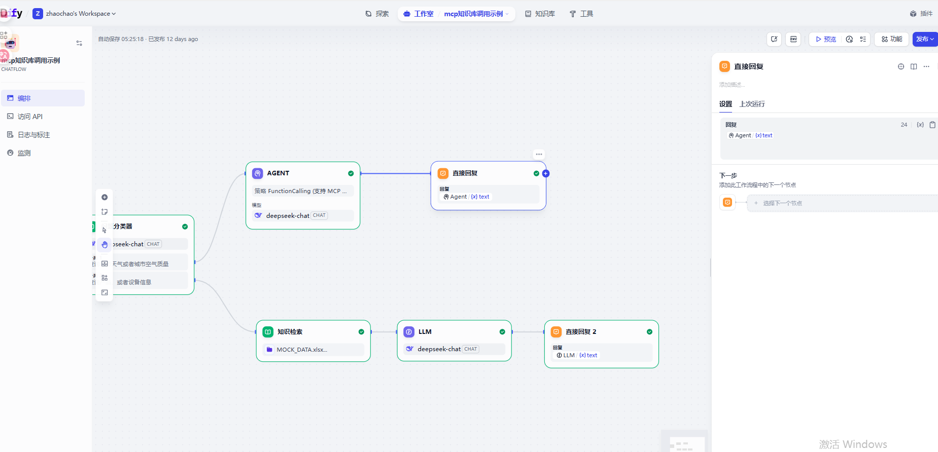 测试MCP,可有看到Agent自动调用了MCP接口并实现了回复
