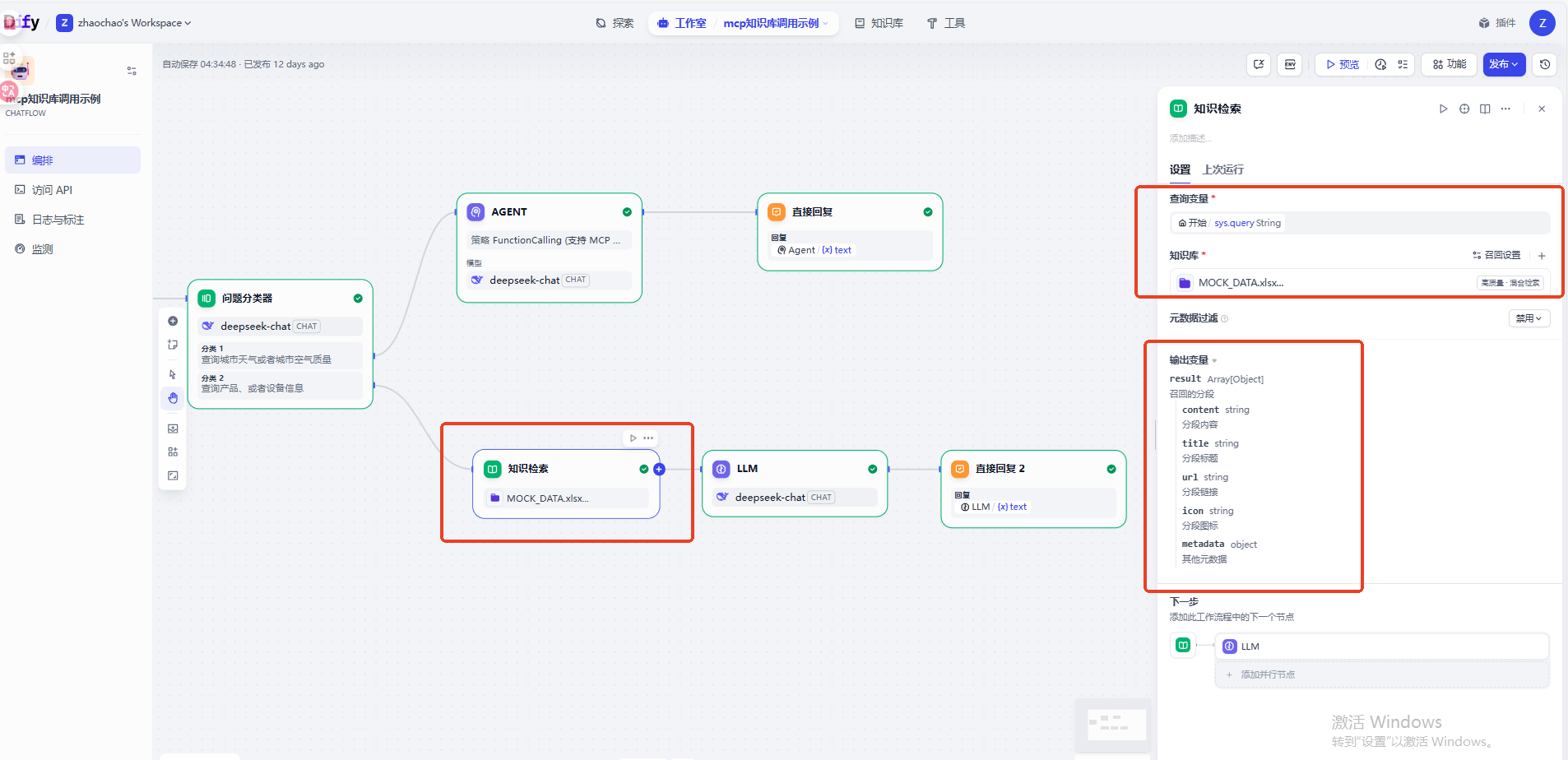 可以先看一下最终需求的实现效果,当我们咨询产品信息的时候工作流会自动调用知识库检索