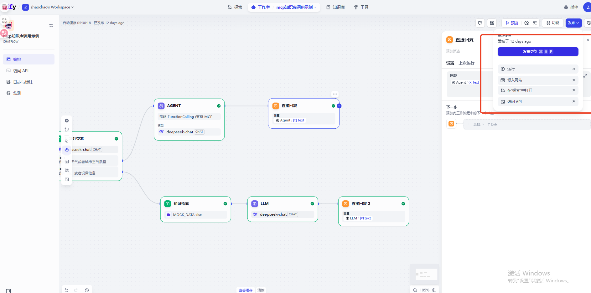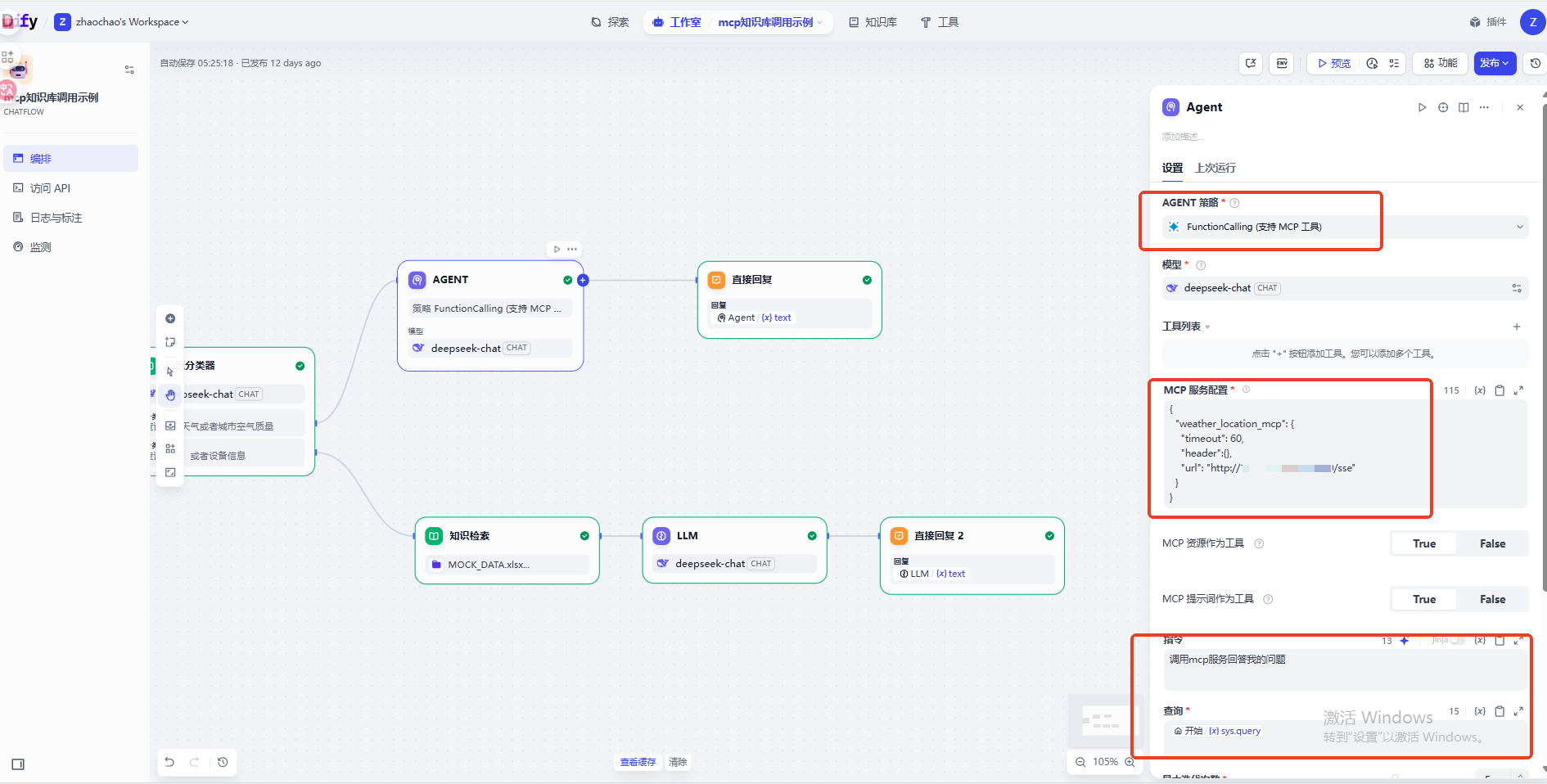 而当我们查询天气相关问题的时候,工作流Agent会自动调用MCP接口给用户回复